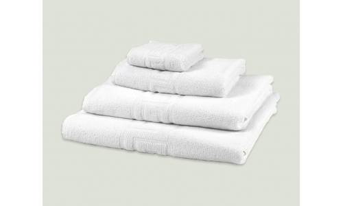 Toalla blanca para hostelería que soporta lavados industriales. Con una elegante cenefa tipo greca en jaqcuard Toallas básicas de gran resistencia y durabilidad, ideales para hostales, hoteles, residencias y cualquier tipo de alojamiento. Esta disponible en varios tamaños: tocador (30x50 cm), lavabo (50x100 cm) ,ducha (70x140 cm) y sábana (100x150 cm)