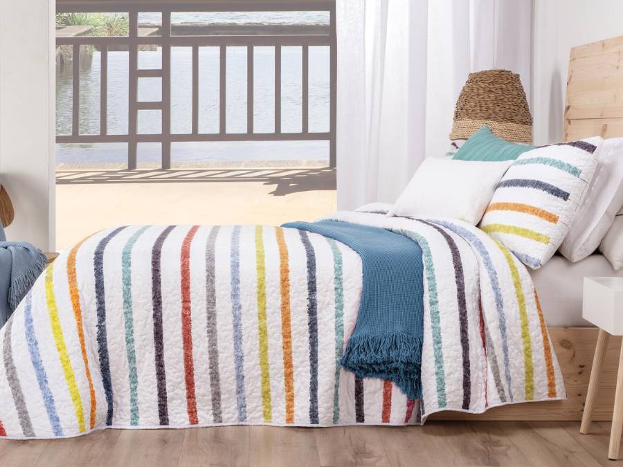 Un colcha bouti juvenil, con dos diseños diferentes. La parte superior y principal rayas multicolores sobre fondo blanco