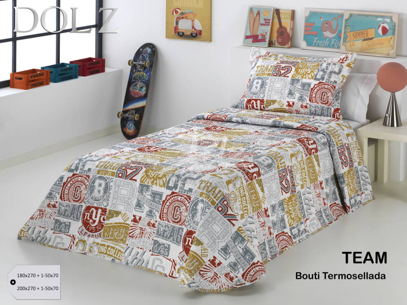 La colcha bouti TEAM de Dolz destaca por su diseño juvenil y deportivo con estampado tipo college americano, ideal para habitaciones modernas.