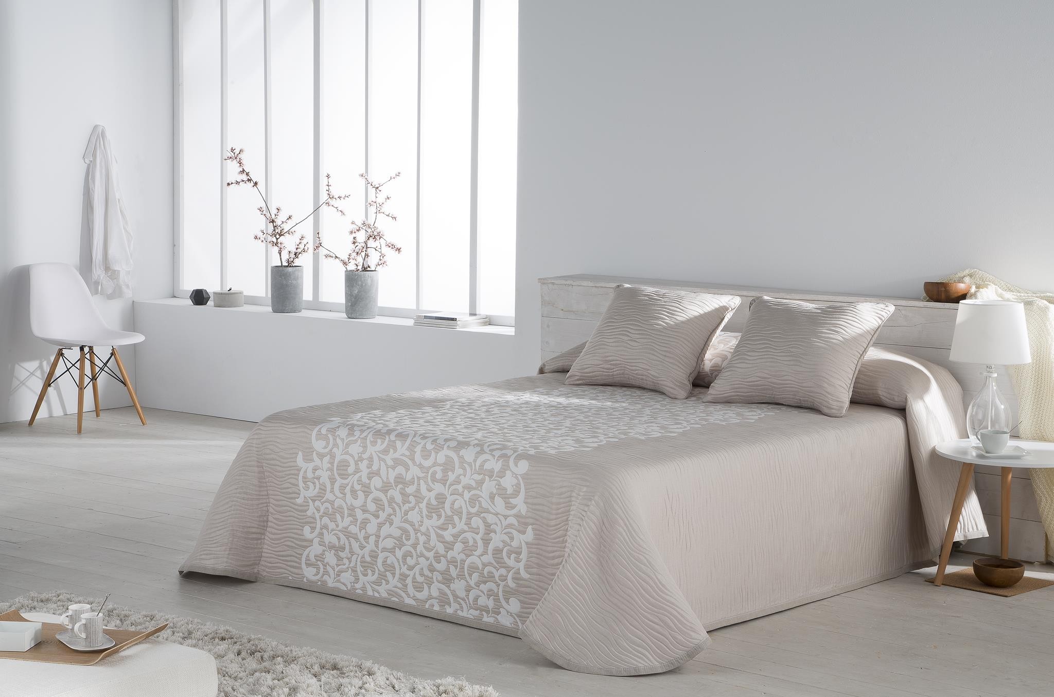Fabricadas en tejido jacquard, hace que su diseño en relieve destaque en la parte inferior de la colcha sobre el fondo de tonos claros.