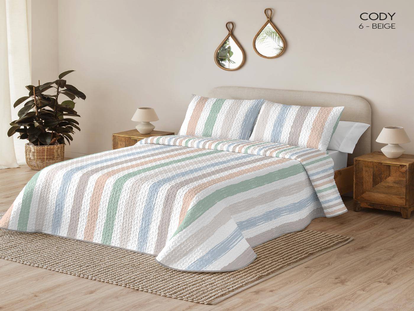 La colcha Bouti Serena CODY de Catotex destaca por su estampado de rayas anchas frescas en tonos pastel, ideal para aportar luminosidad y calidez al dormitorio.