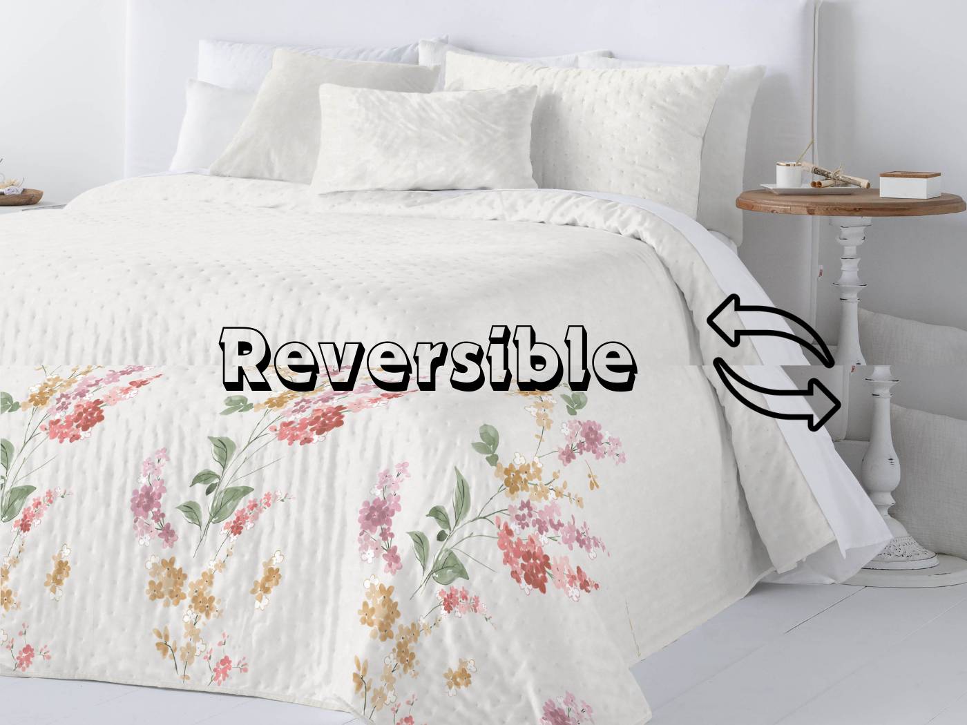 Esta colcha, en la parte inferior de su cara principal, presenta sobre un fondo crudo, un estampado de flores de tonos suaves como rosa, amarillo y verde