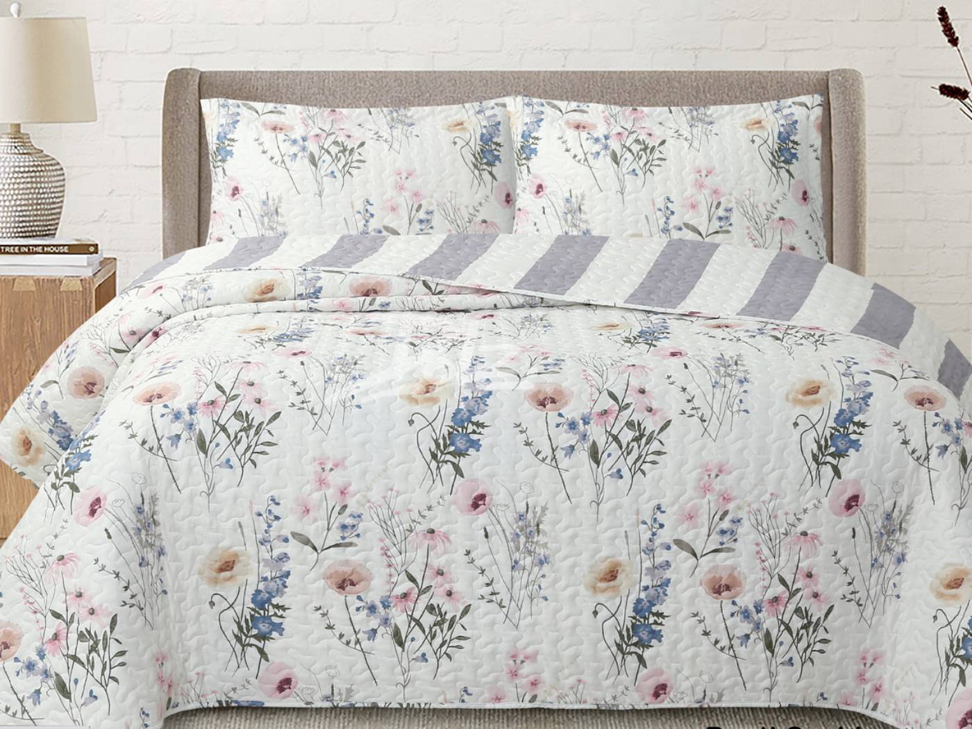 En reverso, al dar la vuelta a la colcha, encontramos un estampado mucho más sobrio y neutro. Se trata de un diseño geométrico que combina frnajas anchas en color blanco y azul