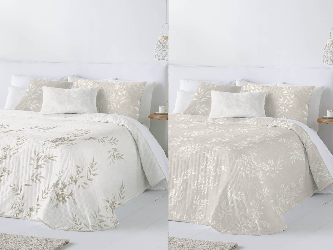 Una cara principal con un contraste más definido de hojas beige/topo sobre un fondo claro, y un reverso con el mismo motivo vegetal en un tono más discreto y sutil (casi tono sobre tono) sobre un fondo beige ligeramente más oscuro, ambas caras aportando una estética natural, elegante y serena al dormitorio.