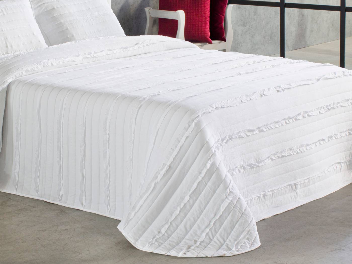 Este modelo destaca por su exquisito diseño de texturas en relieve, donde franjas horizontales limpias se fusionan con delicados volantes fruncidos, creando un patrón orgánico y rústico-chic que aporta volumen y dinamismo visual a la cama.