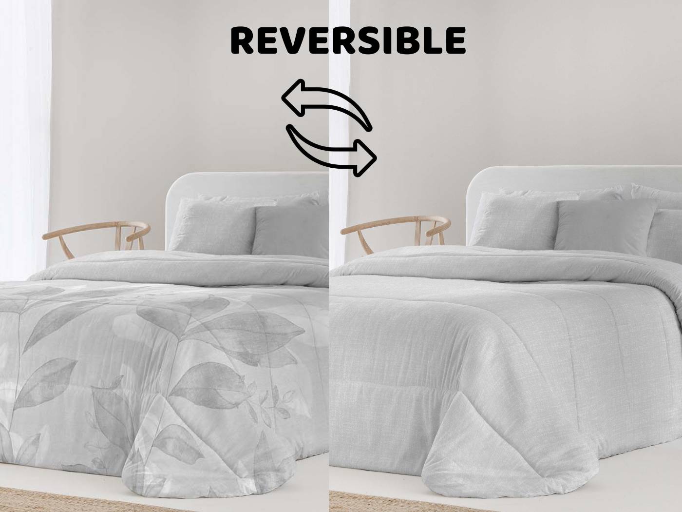 Este modelo destaca por su diseño reversible, que te permite cambiar el estilo de tu dormitorio con solo darle la vuelta. Por un lado, presenta un elegante estampado en tonos gris suave sobre fondo blanco, con hojas de diferentes tamaños y texturas que aportan un toque natural y sofisticado.