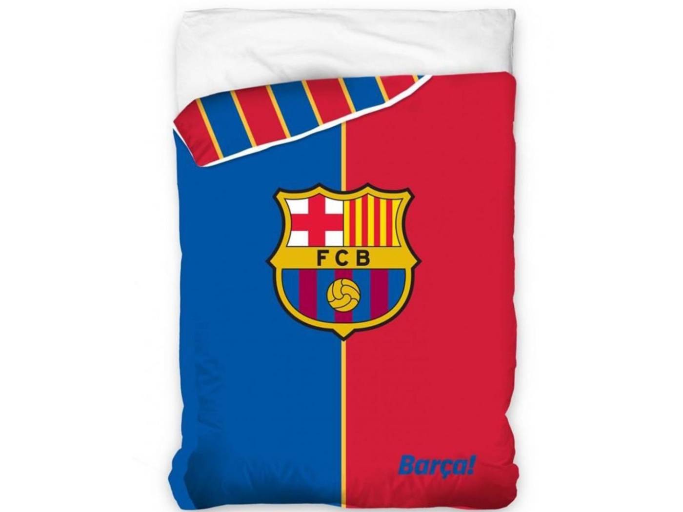 Edredón Nórdico BARCELONA F.C con diseño estampado de dos franjas una azul y otra roja , los colores típicos de este equipo de futbol y el escudo en la zona central