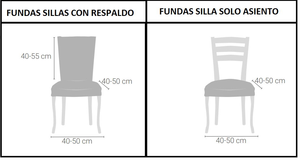 | Medidas | Pack 2 Fundas Silla + Respaldo, Pack 2 Funda Silla Asiento |