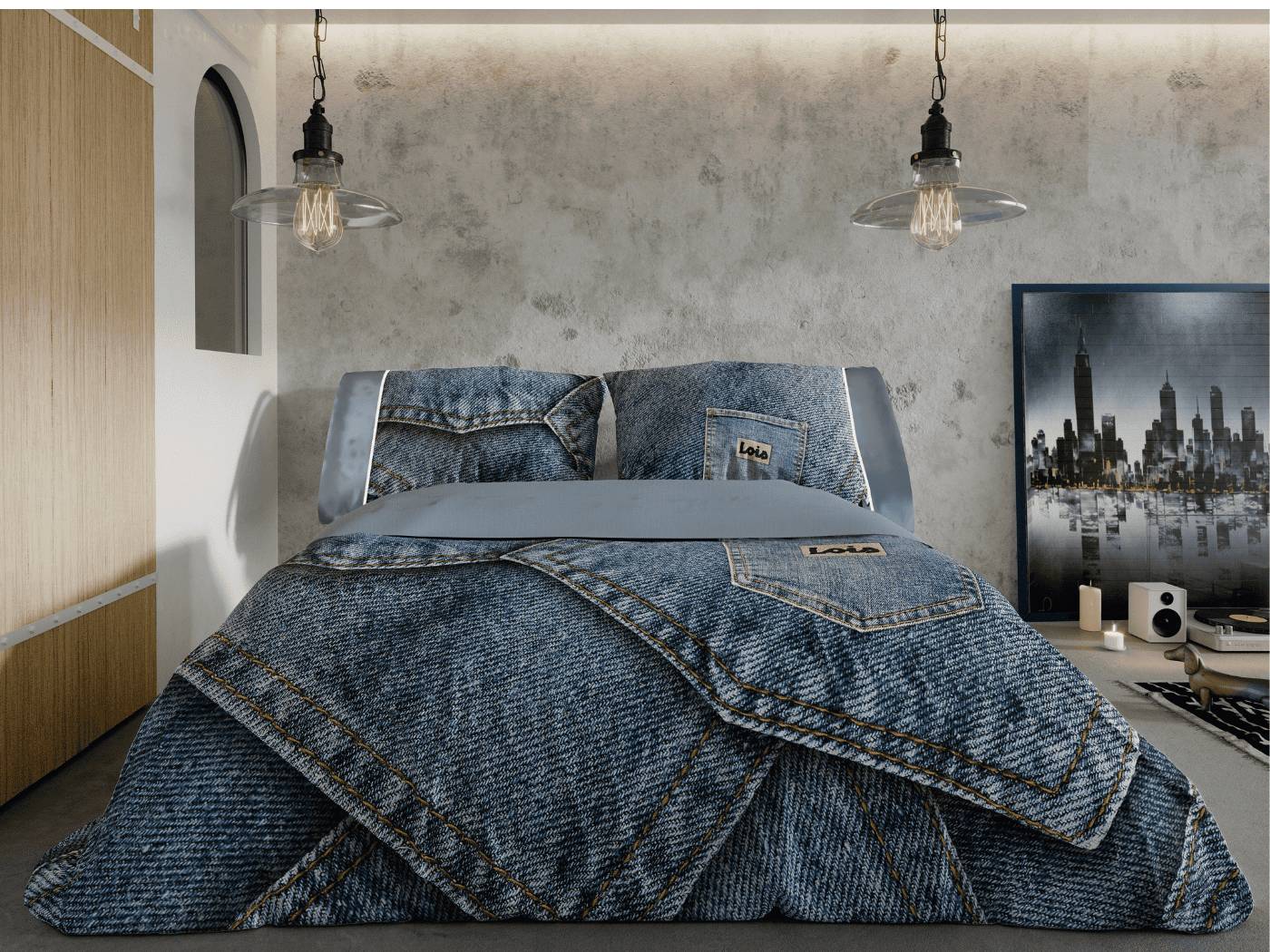 Su diseño, inspirado en las costuras y texturas del tejido vaquero, aporta un aire juvenil y contemporáneo al dormitorio, convirtiéndolo en un espacio con carácter propio.
