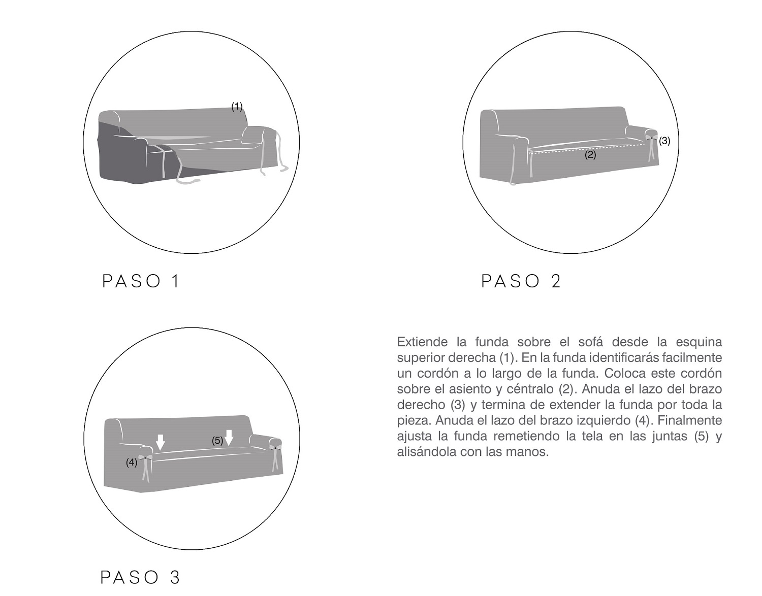 Se sujeta con unas tiras de tejido con las que hacemos cuatro lazos en el frente y la parte trasera del sofá, que dará elegancia y seriedad a la hora de cubrir tu sofá.