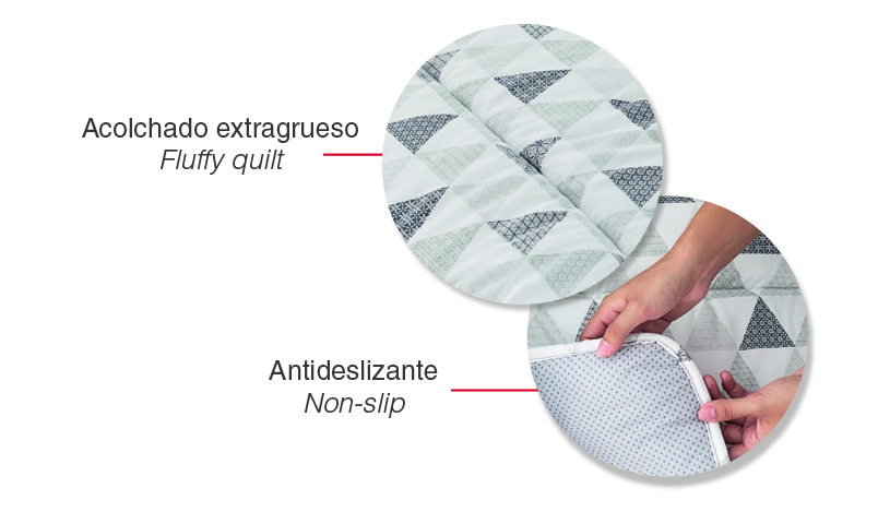 La cara principal confeccionada en tejido microfibra acolchado extragrueso y el reverso con un tejido antideslizante