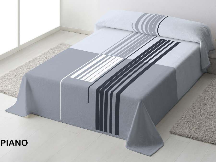 Una manta de cama, con un moderno diseño donde destacan un rayas en diferentes tonos en la parte central