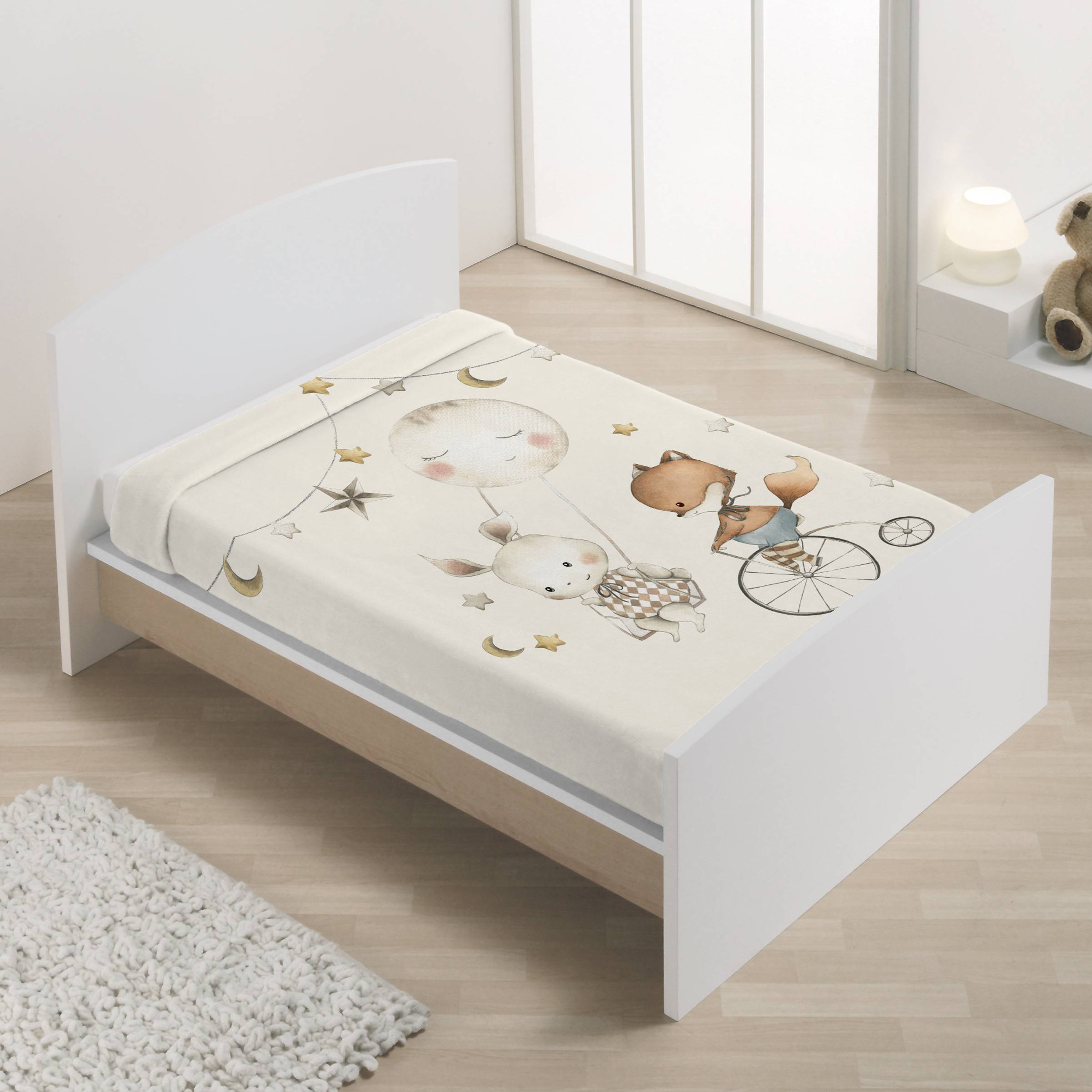Su diseño encantador muestra a un zorro y un conejito viajando hacia la luna, rodeados de estrellas y lunas sonrientes, creando un ambiente lleno de dulzura y fantasía que hará de la hora de dormir un momento mágico. Perfecta para decorar la cuna y acompañar los sueños más tiernos.