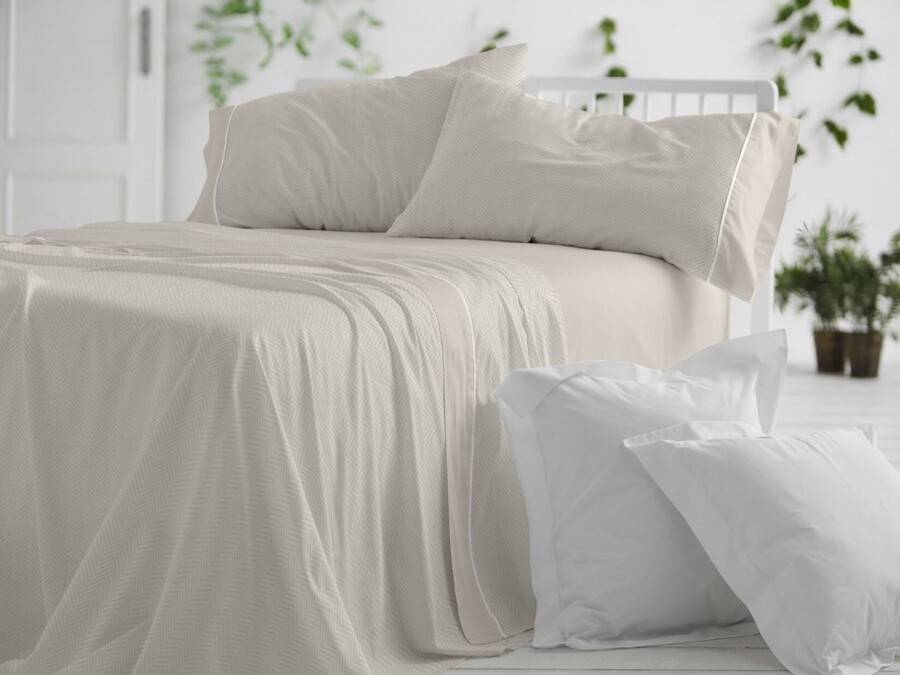 La sábana bajera y también las aplicaciones que realzan las bocas de la almohada, van en tono liso a juego