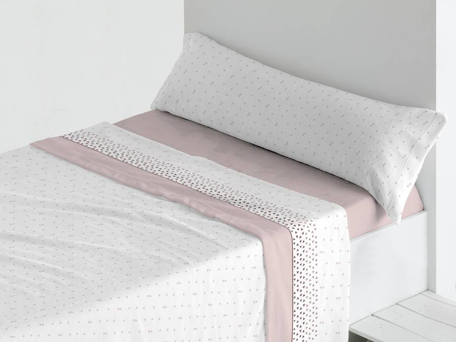 La almohada y la sábana encimera presentan el mismo diseño de pequeños triángulos sobre fondo blanco. La sábana encimera tiene una franja decorativa lisa en el mimos color que la sabana bajera, y encima el mismo patrón de triángulos pero mas oscuros, creando un contraste elegante.