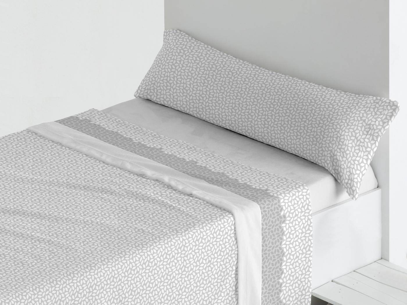 La funda de almohada y la sábana encimera están cubiertas patrón de hojas o pétalos entrelazados y redondeados. La sábana bajera se mantiene en un tono liso, creando un elegante contraste que equilibra la riqueza del estampado.