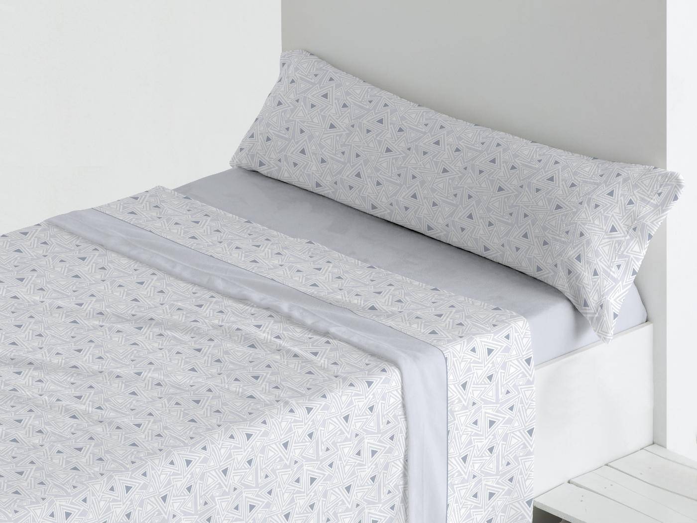 La funda de almohada y la sábana encimera tienen un diseño geométrico de triángulos entrelazados,