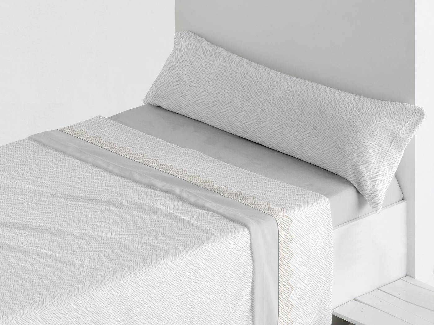 Presentan un estampado geométrico de pequeños puntos que forman un patrón en zigzag. En la parte superior de la sábana encimera, hay una franja decorativa con un motivo de cenefa que se repite, con un patrón de puntos similar pero en una disposición diferente. La funda de almohada tiene el mismo diseño geométrico que el resto de la sábana.