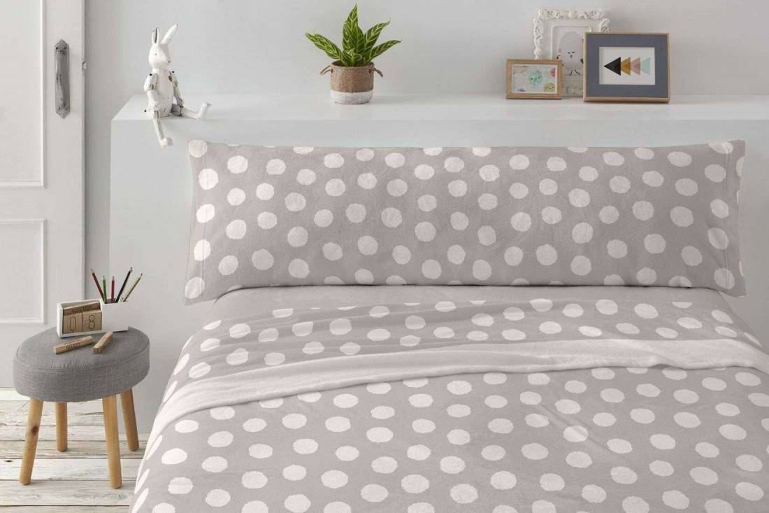 La sábana encimera incluye un embozo en tono crudo, a juego con los topos, mientras que la bajera se presenta en color liso sin estampado, creando un contraste armonioso y sofisticado.
