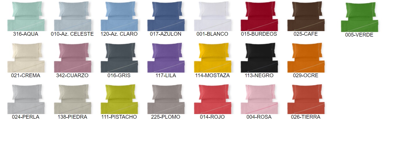 | Color | Amarillos, Beige, Blanco, Granate, Morados, Grises, Azules, Naranjas, Rosas, Verdes, Negro |
