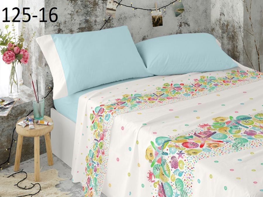 Un juego de sábanas de diseño de fondo marino en tonos multicolor para un juego de sábanas absolutamente primaveral y luminoso