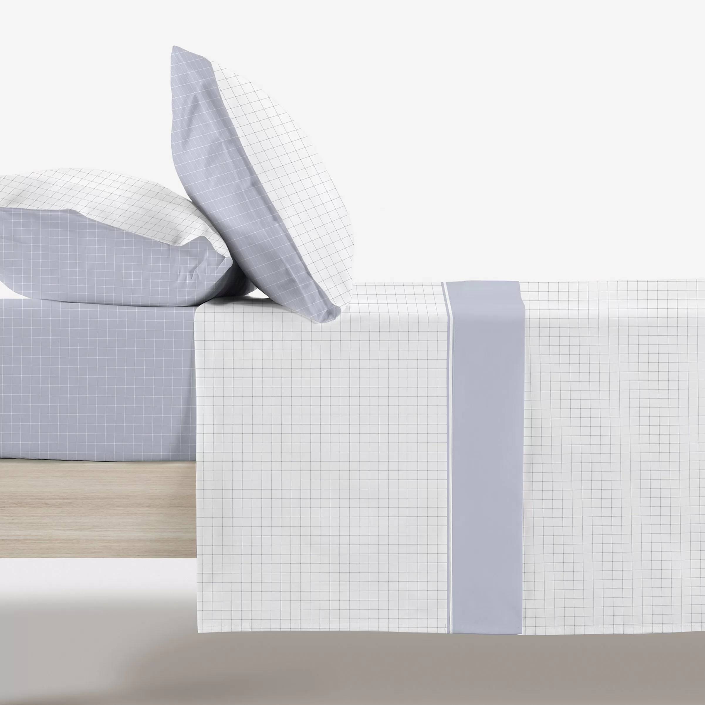 La encimera está estampada con dibujo a cuadros con el fondo blanco y con jaretón ocupado. La sábana bajera va estampada con el mismo dibujo pero invertido