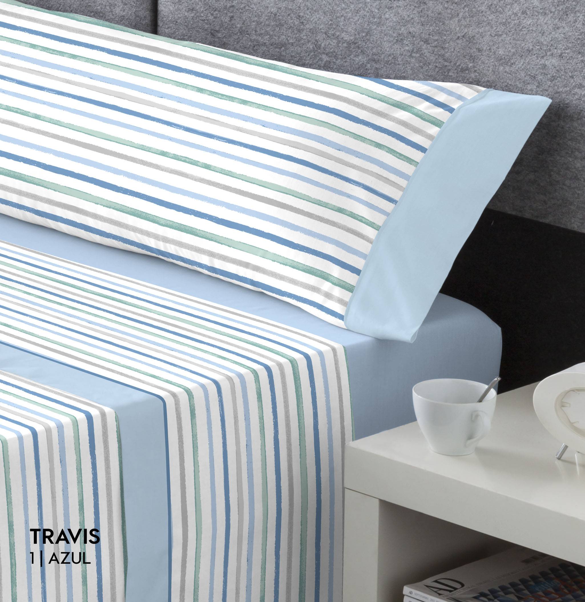 Este Juego Sabanas Bon Diorno TRAVIS de la firma de española Catotex, destaca por su diseño atemporal de rayas horizontales con efecto pincelado en la encimera y funda de almohada.
