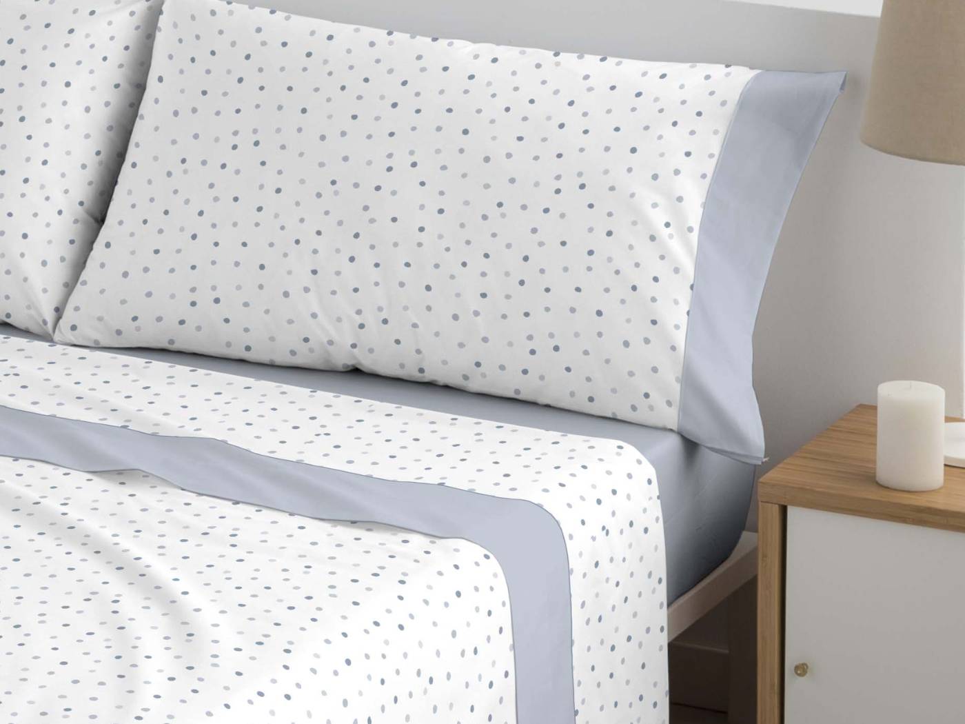 La sábana encimera y la funda de almohada presentan un fondo blanco decorado con pequeños lunares multicolores , acompañado de una cenefa lisa que aporta un toque elegante y distintivo.