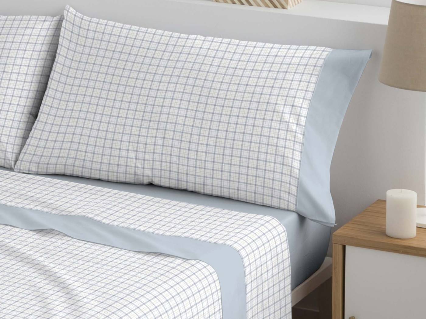 Su diseño destaca por un delicado estampado de cuadros, muy elegante y fácil de combinar, presente en la sábana encimera y la funda de almohada.