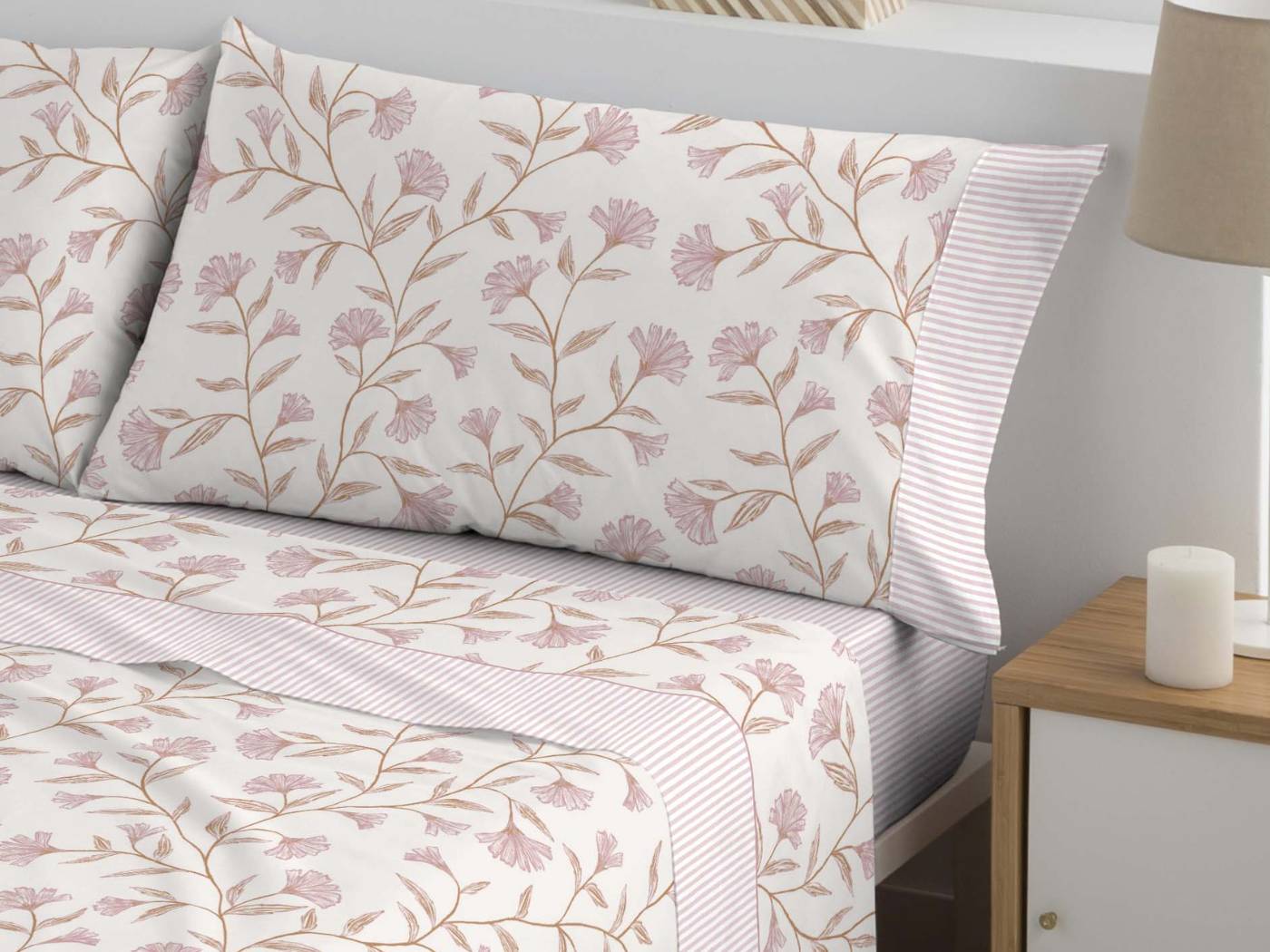 Su diseño destaca por un delicado estampado floral en tonos nude, que aporta un aire fresco, natural y relajante al dormitorio.Este estampado se combina con un elegante detalle de rayas finas en la encimera y las fundas de almohada, creando un contraste sutil que eleva el estilo del conjunto.