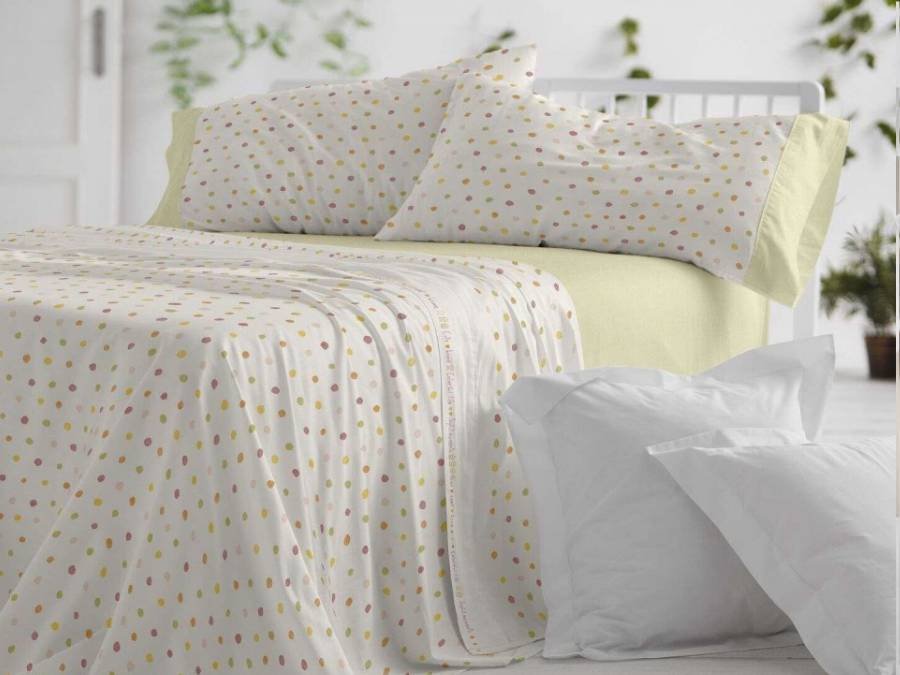 Una sabana infantil/juvenil Un diseño con pequeños lunares en tonos nude, mostaza, musgo, teja y vino sobre un fondo color crema.