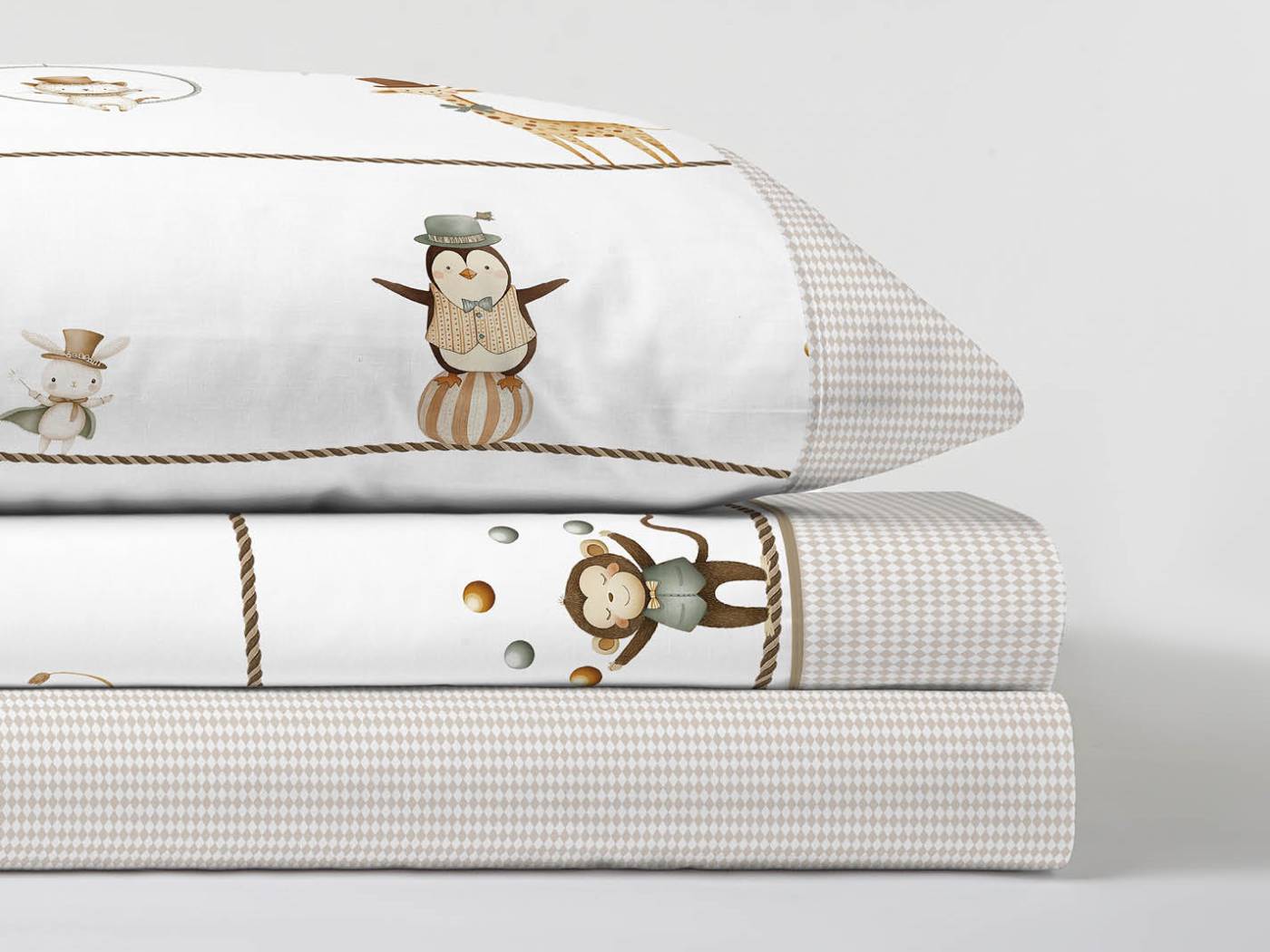 La sábana encimera y almohada: Presentan a simpáticos animales realizando acrobacias sobre cuerdas, rematados con un aplique decorativo y un vivo que resalta la calidad de la prenda.