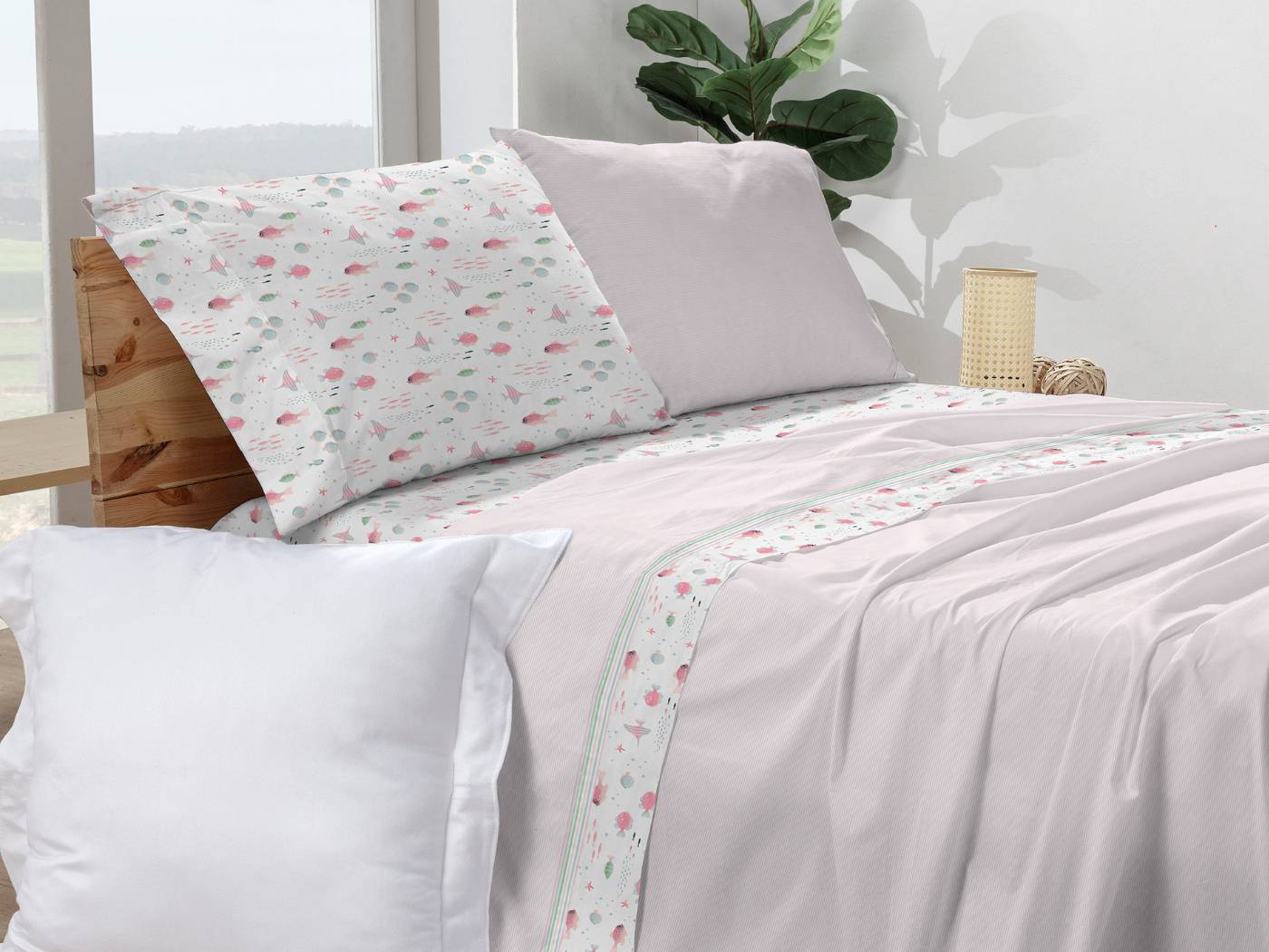 El juego de sábanas Junior 609 de Manterol destaca por su diseño inspirado en el mundo marino, donde pequeños peces y elementos acuáticos crean una atmósfera alegre y relajante, ideal para acompañar los mejores sueños de los niños.