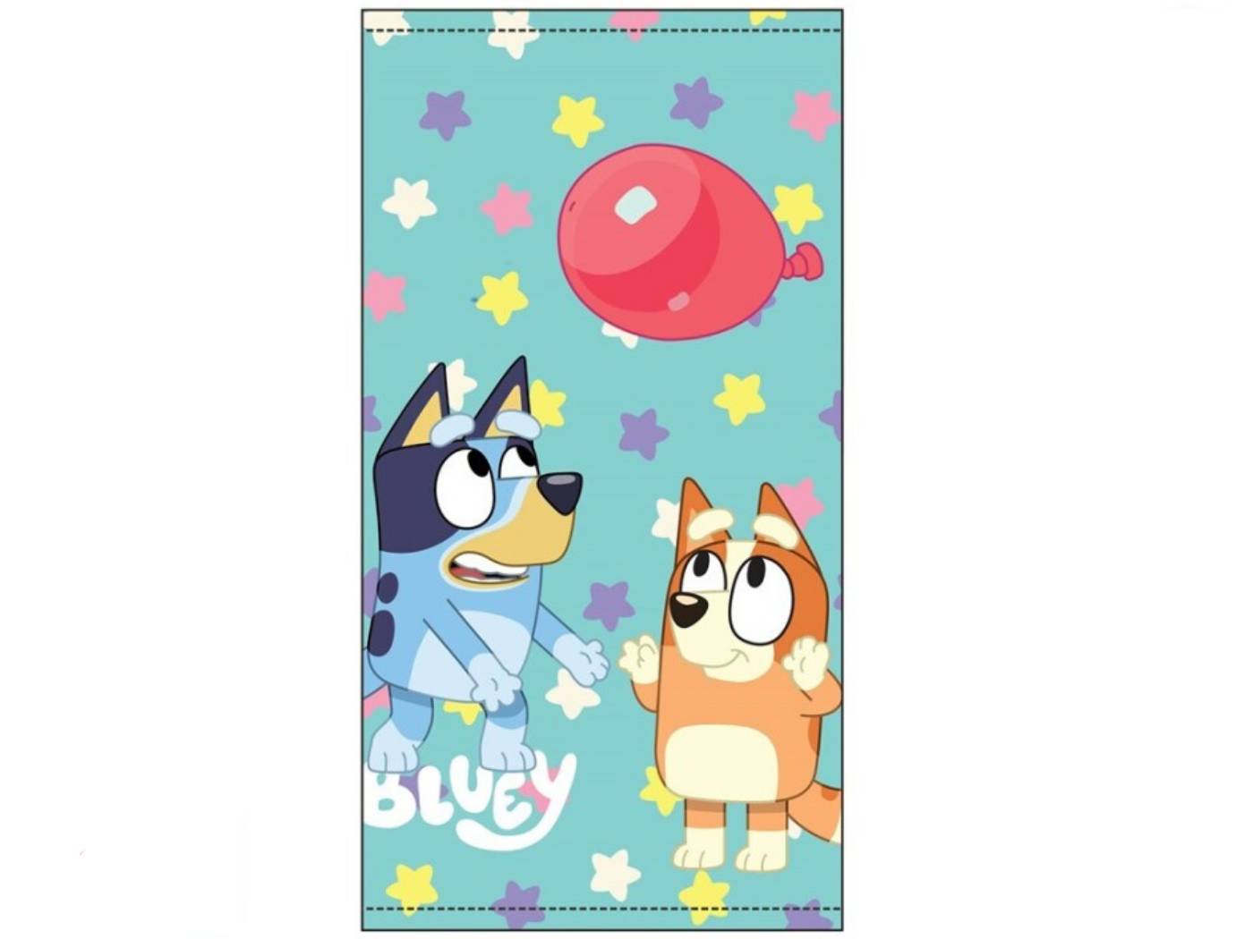 Esta alegre toalla de microfibra está protagonizada por los carismáticos personajes del popular dibujo animado Bluey, sobre un fondo azul con estrellas de colores y un globo rojo que añade un toque de juego y fantasía.